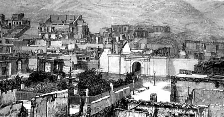 Calle Lima reducida a escombros por genocidas chilenos, enero de 1881
